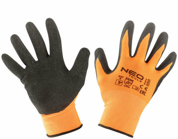 Poliészter munkavédelmi kesztyű, latex (crinkle) bevonattal, 3131X, 97-641, NEO - alacsony kockázatú munkákhoz használt kesztyű. A kesztyű védelmet nyújt az apróbb mechanikai hatások okozta sérülések, a gyenge és könnyen visszafordítható hatású tisztítószerek, az időjárási tényezők, a gyenge ütések és rezgések ellen. Házi használatra valamint szállítási, szere