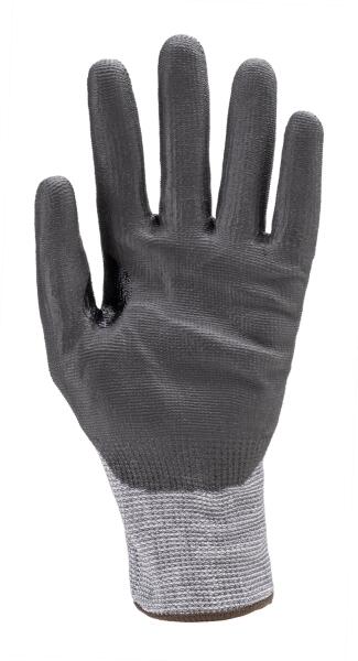 maximális szakítás-, szúrás- és kopásállóságú, a legmagasabb F szintű TDM vágásbiztossággal, multiszálas (HDPE, poliészter és spandex alapanyagú) szürke védőkesztyű tenyerén fekete kopásálló PU mártás, kiváló fogásbiztosság nitril megerősítés a mutató- és hüvelykujj között, 100¬iC kontakt hőhatásnál 15 sec időtartamig nyújt védelmet használata első