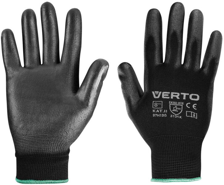 PU bevonatú kerti kesztyű, mérete 10", lélegző külső szövet, II kategória, dörzsállóság: 3, átvágásállóság: 1, tépésállóság: 3, átszúrásállóság: 1 Verto PU bevonatú kerti kesztyű rugalmas gumirozással van kialakítva a csuklónál. A kézben tartott szerszámok és anyagok tapadását növelő poliuretánnal van a tenyérrész bevonva. Az anyagösszetétel jó lég