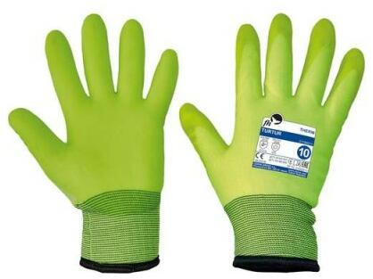 TURTUR téli nylon PVC mártott kesztyű 10 Melegen bélelt, kötött, vízlepergető nylon kesztyű, figyelemfelkeltő sárga színben. Tenyéren PVC-vel mártott. Vastag béléssel és rugalmas mandzsettával.