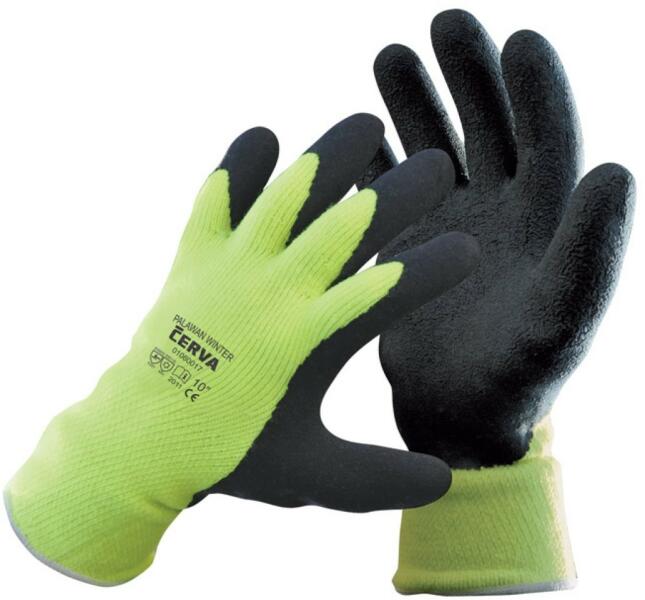 Melegen bélelt mártott védőkesztyű Téliesített kötött nylon védőkesztyű mikropórusos és páraáteresztő latex réteggel tenyéren és ujjakon. Rugalmas kötött mandzsetta. Az alapkesztyű anyaga: nylon A kesztyű mártás anyaga: latex Szín: sárga Kiszerelése: 12 pár / csomag. Minimális rendelési mennyiség 1 csomag /méret. A gyári bontatlan karton pár kesztyűt tartalmaz.