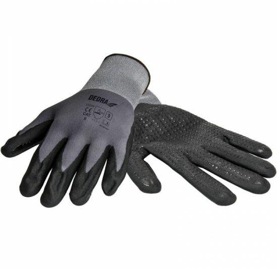 Megfelelőségek: EN388 4131 Kötött, varratmentes nylon alapra mártott PU, szerelőkesztyű. A kesztyű tenyere és az ujjak is mártva vannak így a koszosabb munkáknál ideális választás. Használható finom szerelési munkákhoz és minden olyan helyen ahol a terméket vagy a dolgozó kezét egy vékony kesztyűvel védeni lehet. A kesztyű méretenként 12 páras csomagokban van, minim