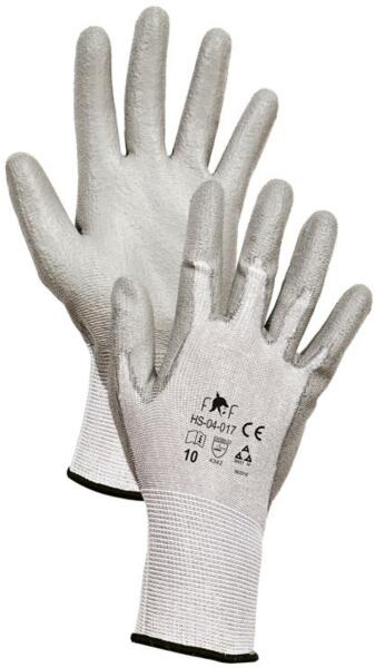 YT-7472 szürke poliészterből készült munkavédelmi kesztyű, a markolat részen világosszürke, fokozott kopásállóságú poliuretán bevonattal. méret: 10 markolat rész: PU bevonatú felső rész: poliészter öltés: 13G rugalmas mandzsetta kopásállóság: nagyon jó, 3-as védelmi szint vágásállóság: alap, védelmi szint 1 szakítószilárdság: nagyon jó, védelmi szint 3 át