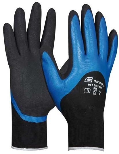 Gebol Wet Grip kesztyű nitrill bevonattal Leírás: A Gebol Wet Grip munkakesztyű professzionális minőségével lenyűgöz, 3/4-es nitril bevonattal ellátott nylonból. A tenyerén lévő további nitril-homokos bevonatnak köszönhetően a nedves markolat abszolút olaj- és víztaszító, és tökéletes minden zsíros és nedves munkához. A nagyon jó illeszkedés, az optimális tapadás