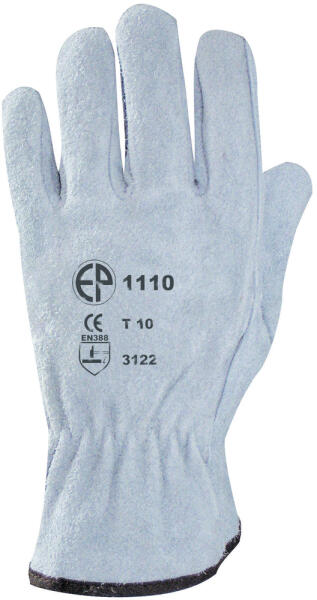 Hasítékbőr védőkesztyű Munkavédelmi védőkesztyű, marhahasíték tenyérrel és kézháttal. A kesztyű felső csuklógumírozású, teljes egészében bőrből készül . Kézre simuló kialakításának köszönhetően kényelmes en lehet benne dolgozni. A termék gyűjtő csomagolása: 12 pár/ tasak Kartonos kiszerelése: 120 pár / karton. Megfelel a következő EU szabványnak: EN42