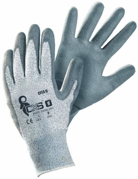 Cita II D szintű vágásbiztos kesztyű Ez a mártott kötött kesztyű kiváló vágásbiztos védelmet nyújt a D szintű vágásbiztonsággának köszönhetően. A tenyér és az ujjak polyuretánnal vannak bevonva , amely nagyszerű kopás- és vágásállóságot biztosít. Ajánlott felhasználási területek: logisztika, raktár, üveglapok és éles tárgyak kezelése, fémlemezek kezelé