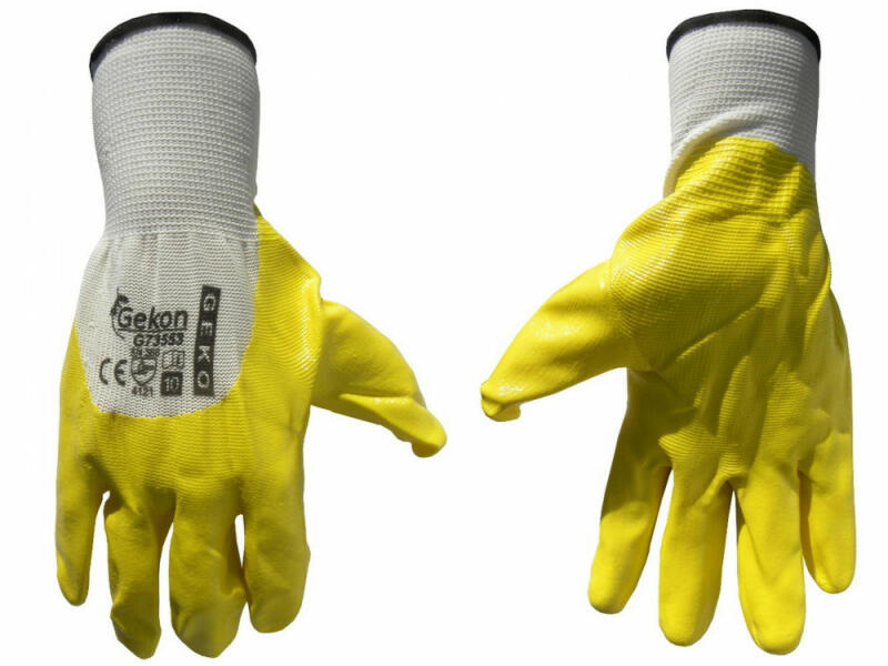 Munkavédelmi kesztyű 10 yellowKötött, varrat nélküli nejlon kesztyű nitril réteggel és az ujjrésznél és rugalmas kötéssel a csuklónál. Technikai paraméterek:Méret: 10nitrillel bevonvakopásállószegéllyel végződik