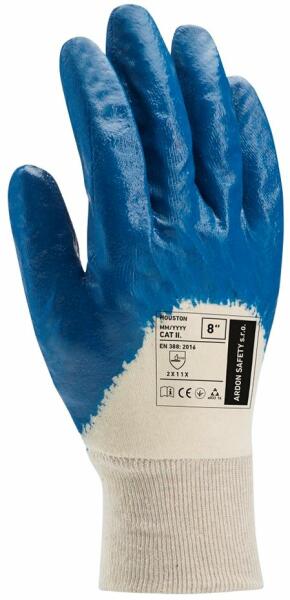 A Houston nitrill mártott védőkesztyű ellenálló a mechanikai sérülésekkel szemben, és olajálló. A pamut kötött anyag puha tapintású, és extra kényelmet biztosít a kéz számára a különböző kézi feladatok elvégzésében. Az ujjbegyek és a tenyér valamint az ökölcsont nitril mártott. Mérettáblázat A kesztyű megfelel az EN388: 2X11szabványnak. 1 pár: 240 Ft 1 cso