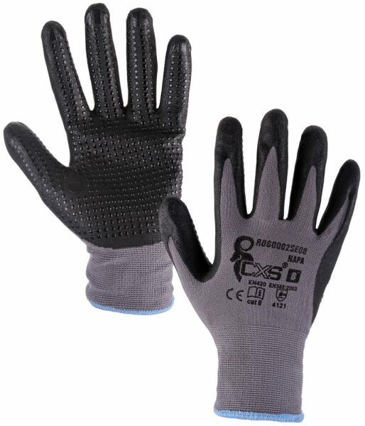 Kézre simuló munkáskesztyű Az varratmentes munkakesztyű puha , kevertszálas kötéssel készül. A szerelő kesztyűnek a tenyere és ujjai lélegző mikrohabosított nitril bevonattal vannak ellátva. A jobb tapadás érdekében PVC pöttyökkel is ellátták. A szerelő kesztyű 100% nylonból készült kesztyű kiváló minőségű és tartós védelmet nyújt. Megfelel az EN 420 és EN 3