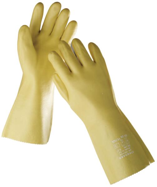 STANDARD ke 9 kesztyű PVC 35 cm - sárga Kötött pamutkelméből varrt, PVC-be mártott, sav- és alkáliálló kesztyű.