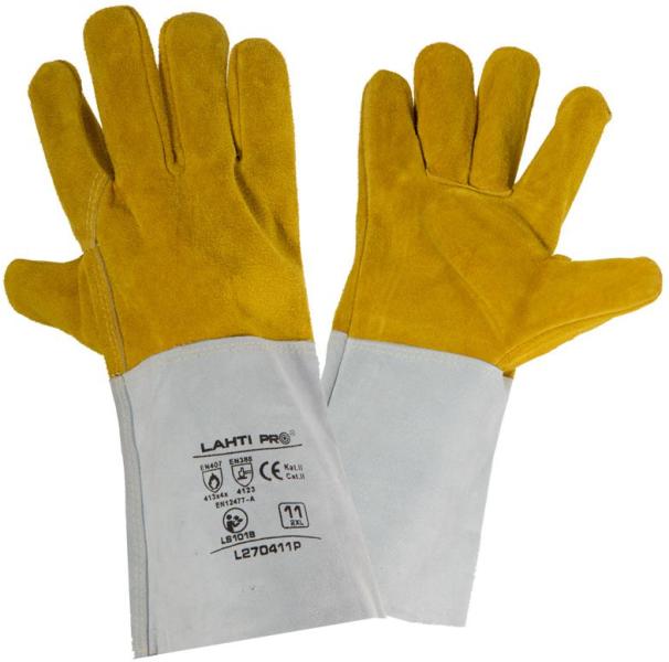 Anyag: bőr, pamut. Kesztyű hosszúsága: 35 cm. A tenyér egész része egy darab bőrből készült. Rendkívül kopásálló (4. ellenállás szint). Nagyon ellenálló a gyulladás forrásokkal, a hővel, valamint a forró, olvadt fémcseppekkel szemben (4. ellenállás szint). NORMA: EN 420, EN 407, EN 388, EN12477-A