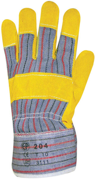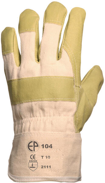 SÁRGA PAMUT TENYÉRBÉLÉSES MARHABŐR KESZTYŰ: sárga marhahasíték tenyér vászon kézhát és mandzsetta artéria-, köröm- és ökölcsontvédő pamut tenyérbélés MÉRET: 10-es CSOMAGOLÁS: 120/12 EU szabvány: EN420, EN388: 3111