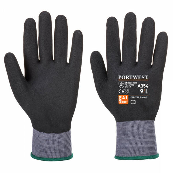 Portwest A354 DermiFlex Ultra Pro kesztyű A DermiFlex Ultra a 3/4-ig mártott A352-hez képest a teljes mártásnak köszönhetően további védelmet nyújt víz, olaj és zsír ellen. A szuper könnyű, 15 mm-es nylon bélés puha nitrilhabos tenyérrel rendelkezik a tökéletes kényelem és kézügyesség érdekében. Jellemzők Rugalmas homokos nitril bevonat, mely kiváló tapadást biztos