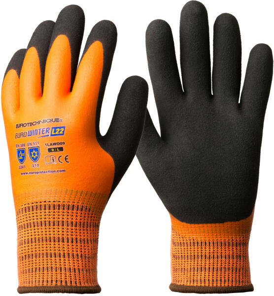 1LAWO – EUROWINTER L22 13-as kötésű, Hi-Viz narancs színű, bélelt akril kesztyű narancs latex-szel végig mártott alapréteg tenyerén plusz fekete Sandy speciális csúszásbiztos latex réteggel könnyű, extra kényelmes, kézre simuló forma, nagy ellenálló képességgel és nedves környezetben is extra csúszásbiztossággal minősített hideg elleni védelem és maximális kopá