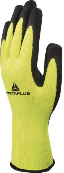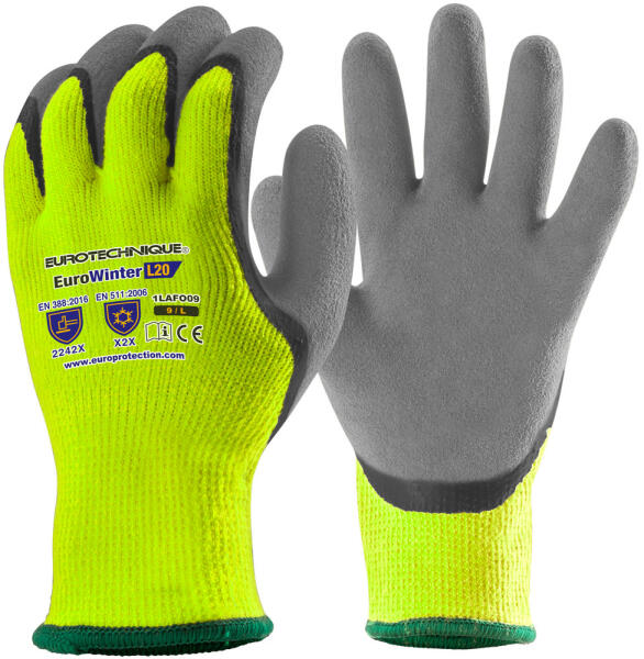 1LAFO EUROWINTER kesztyű 10-es kötésű, Hi-Viz sárga színű, bélelt akril kesztyű tenyerén speciálisan csúszásbiztos és vízálló szürke habosított latex-szel mártva könnyű, nagyon kényelmes, kézre simuló forma, nagy ellenálló képességgel és nedves környezetben is extra csúszásbiztossággal minősített hideg elleni védelem, maximális szakítóerővel szembeni ellen