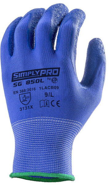 1LACB SIMPLY PRO SG8050L latex mártott kesztyű 13-as kötésű kopásálló kék poliészter alapkesztyű tenyéren kék színű latex mártás, csúszásbiztos felülettel nedves környezetben is extra csúszásbiztosság kényelmes formai kialakítás rugalmas, gumírozott mandzsetta MÉRET: 6, 7, 8, 9, 10 és 11-es CSOMAGOLÁS: 100/10 EU szabvány: EN388:2016 3131x