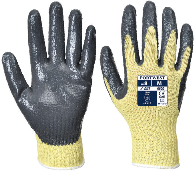 Az A600 típus 10-es kötésű para-aramid alapkesztyűvel rendelkezik, nitril tenyérmártással. Kiváló vágásbiztosság és fogásbiztonság! Üveg, fém, vagy más olajos felületű munkadarabok kezelésére javasoljuk.