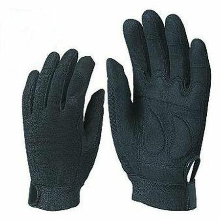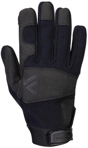 Fekete szintetikus bőr nagy igénybevételre (60% kopásálló PA, 40% könnyű PU) Szivaccsal párnázott tenyér, artéria- és körömvédő Rugalmas fekete poliészter kézhát Elasztikus mandzsetta, állítható tépőzáras szegéllyel Méret: 9