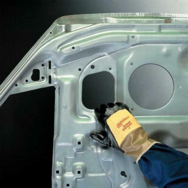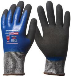 13-as kötésű, legmagasabb szintű szakítás- és kopásállóságú, szúrásbiztos illetve maximális 5-ös szinten Vágásbiztos kesztyű HPPE (high performance PE) + üvegszál alapanyagú védőkesztyű hátrészen végig kék sima nitril mártás + a tenyerén fekete speciális Sandy csúszásbiztos nitril réteg a mártás kiválóan véd zsírok, olajok hatása ellen, a dupla réteg meg