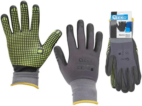 Munkakesztyűk nylonból, pöttyözött latexxel, amely erős és biztos fogást biztosít. A kesztyűk rugalmasak, tartósak és nagyon ellenállóak a kopással és szakítással szemben. A mandzsettának köszönhetően a kesztyűk tökéletesen illeszkednek a kézhez. A további pöttyözött latex erős és biztos fogást biztosít a megfogott tárgyakhoz. Műszaki adatok: Méret: 11 Védelem