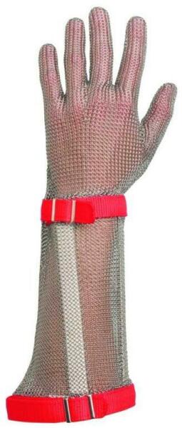 Maximális vágás elleni védelmet nyújtó, mindkét kézen hordható, rozsdamentes acélgyűrűkből készült kesztyű összehúzó textilpánttal, alkarvédővel és 15 cm széles mandzsettával.