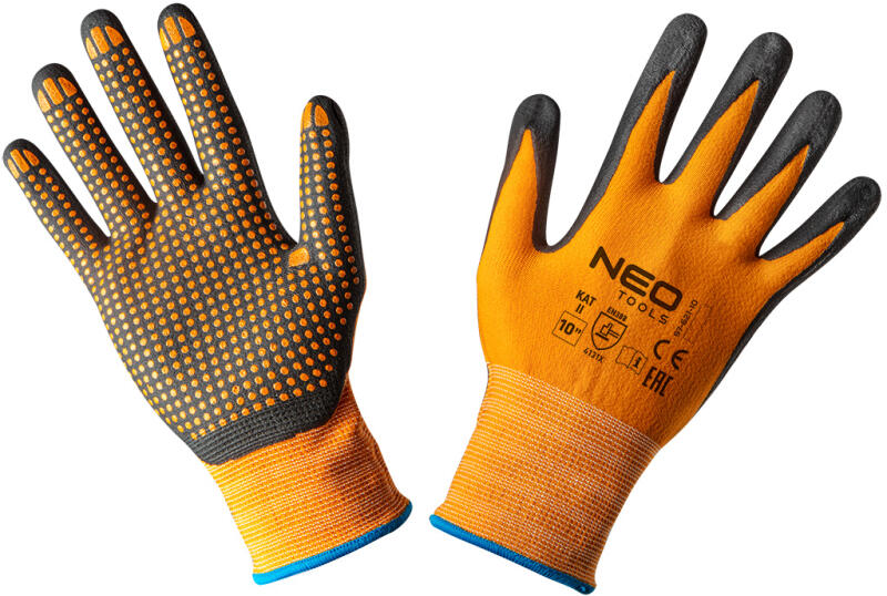 A NEO munkakesztyű védi a kezét a szennyeződésektől, karcolásoktól és a munka közbeni káros hatásoktól. Nitrilbevonatú nejlonból készült, nitril pöttyökkel. Kényelmes használatot biztosítanak, szilárd fogást tesznek lehetővé, még a kisebb tárgyak esetében is, ugyanakkor megakadályozzák, hogy a szerszámok kicsússzanak a kézből. A CE-jelölés biztonsági garancia