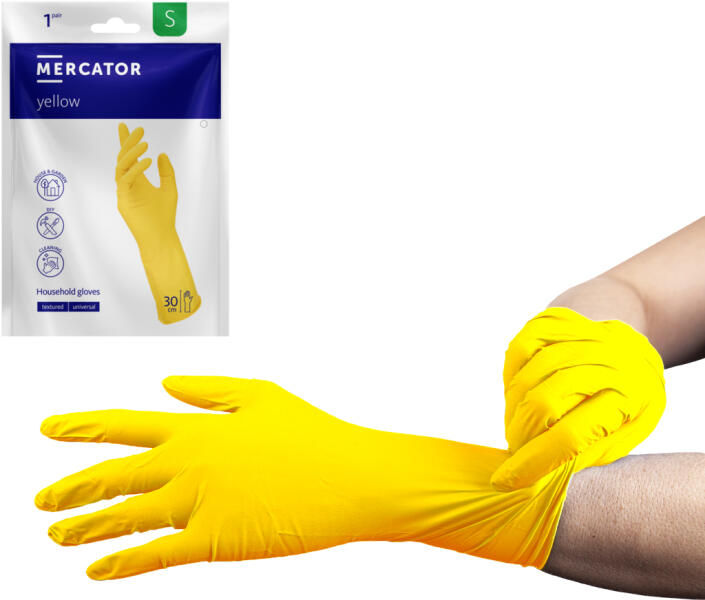 A MERCATOR yellow háztartási kesztyűk megfelelően érdesített tenyérrésszel rendelkeznek, ami megkönnyíti a nedves környezetben végzett munkát, egyben javítva a fogást és a mozdulatok kontrollálását. Természetes gumilatexből készült, sárga, háztartási kesztyű. Puhák és rugalmasak, ami kihat a munka kényelmére és a mozdulatok precizitására. A kesztyű hosszabb szár