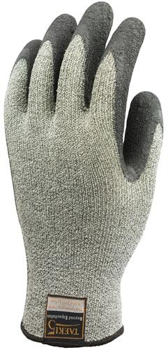 TAEKI 5 SZÜRKE MULTISZÁLAS KOPÁS-, SZAKADÁSBIZTOS TENYÉREN FEKETE REDŐZÖTT LATEX MÁRTOTT KESZTYŰ: Taeki 5® 13-as kötésű multiszálas védőkesztyű: kopás- és szakadásálló, 5-ös szinten, kiemelten vágásbiztos és rugalmas alapanyagok (Spandex®, szintetikus- és üvegszálak) tenyerén fekete, csúszás ellen redőzött latex mártás gumírozott mandzsetta, szellőző kézhá