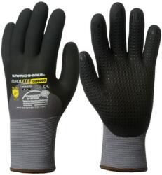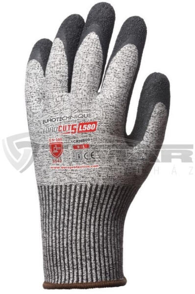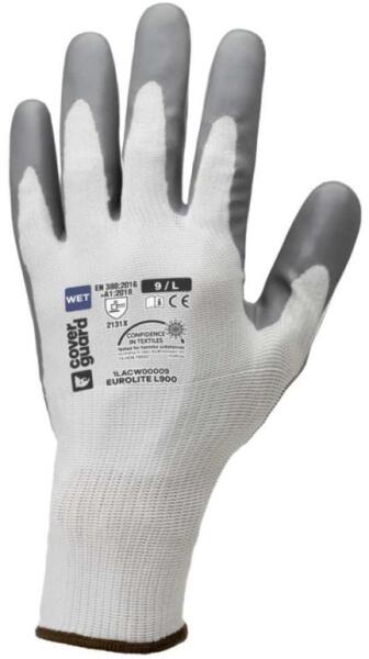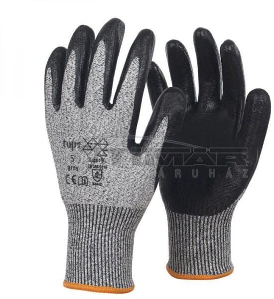 15-ös kötésű, erős szakítás- és kopásállóságú szürke nylon / spandex ökölcsontig fekete szellőző mikrohabosított nitrillel mártott, tenyerén csúszásbiztos pettyekkel szellőző kézhát, gumírozott mandzsetta könnyű, kiemelten komfortos, teljesen kézre simuló formai kialakítás, tenyerén és a kézháton is biztosított szellőzéssel Öko-Tex minősítés EU szabván