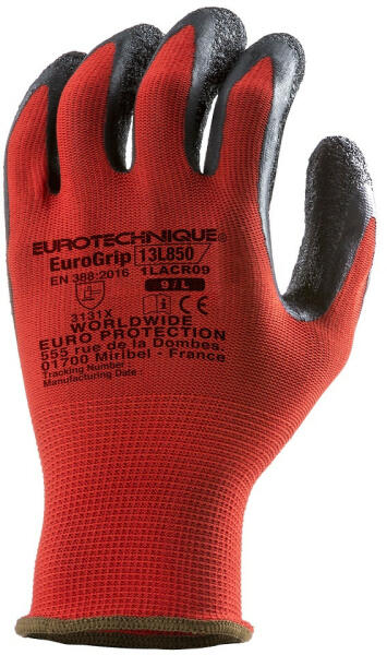 1LACR EUROGRIP 13L850 Latex tenyerű mártott kesztyű 13-as kötésű, piros poliészter védőkesztyű tenyerén fekete, emelt szinten csúszásbiztos latex mártás kiváló fogásbiztosság és extra tapadás szellőző kézhát, gumírozott mandzsetta MÉRET: 6, 7, 8, 9, 10, 11 CSOMAGOLÁS: 100/10 EN388: 2016 3131x1CRLB SIMPLY PRO SC580L