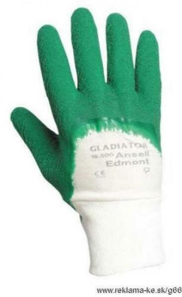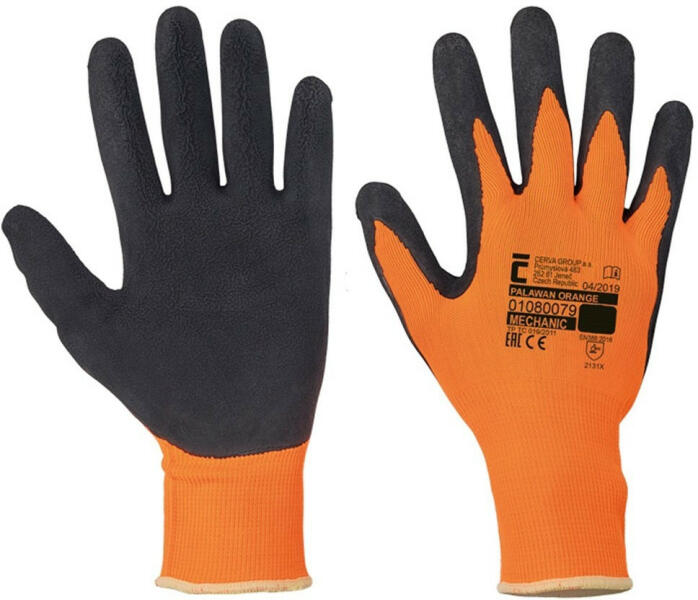 Kötött pamutkelméből varrt, kaucsukba mártott tenyerű és ujjú kesztyű csúszásgátló felületkezeléssel és kötött mandzsettával.