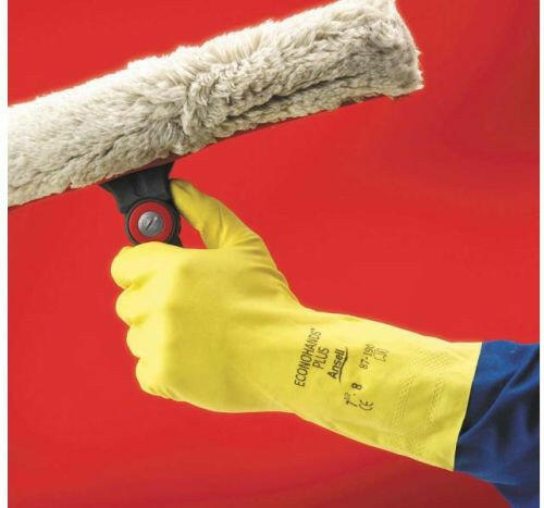 ANSELL 87-190/100 EconohandsPlus - Háztartási munkákra alkalmas - 0,35 mm vastag - természetes latexből készült sárga kesztyű - belül velúrkikészítéssel - Teljes hossza: 30,5 cm.