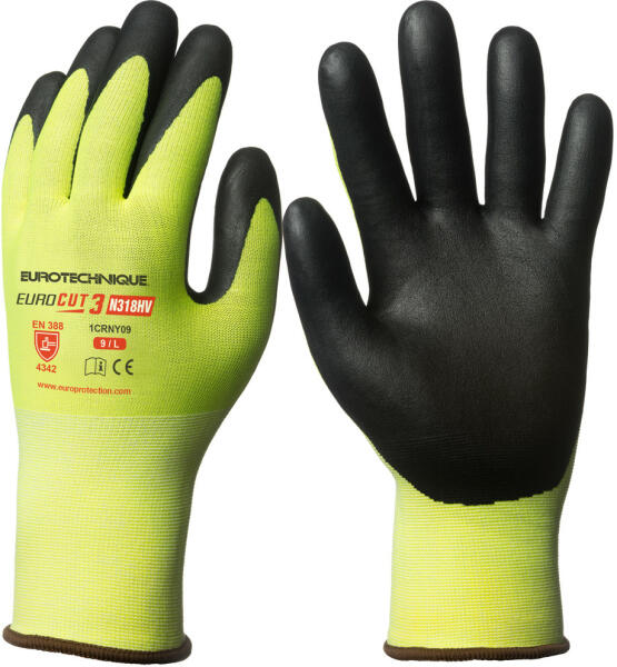 1CRVG – EUROCUT 3 N360 13-as kötésű, legmagasabb színtű szakítás- és kopásállóságú illetve maximálisan szúrásbiztos és 3-as szinten vágásbiztos HPPE (high performance PE) üvegszál alapanyagú védőkesztyű tenyerén szellőző fekete mikrohabosított nitril mártott védőkesztyű megnövelt élettartammal könnyű, extra kényelmes, teljesen kézre simuló formai kialakít