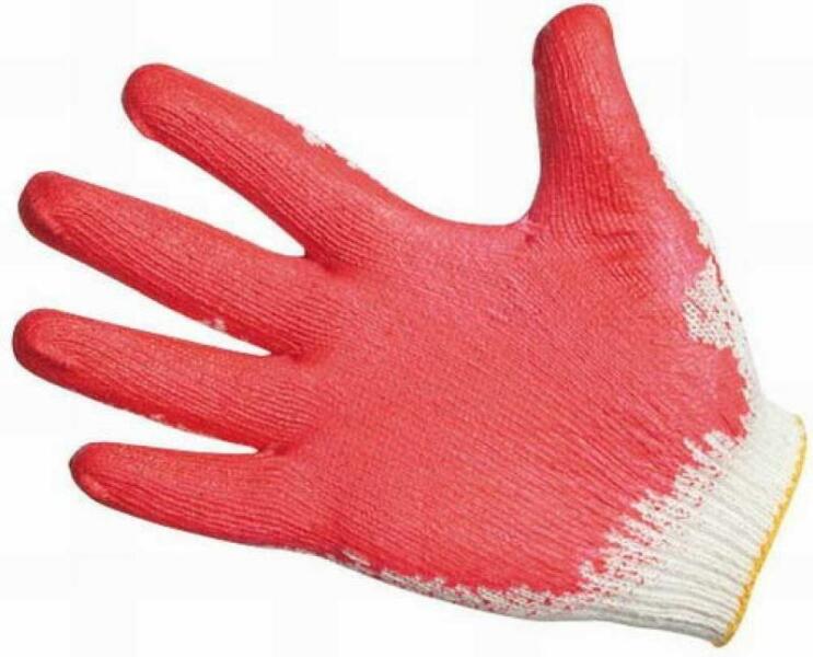 Különböző színű kötött, varratmentes pamut kesztyű színes PVC-be félig mártott tenyérrel és ujjakkal, valamint rugalmas mandzsettával.