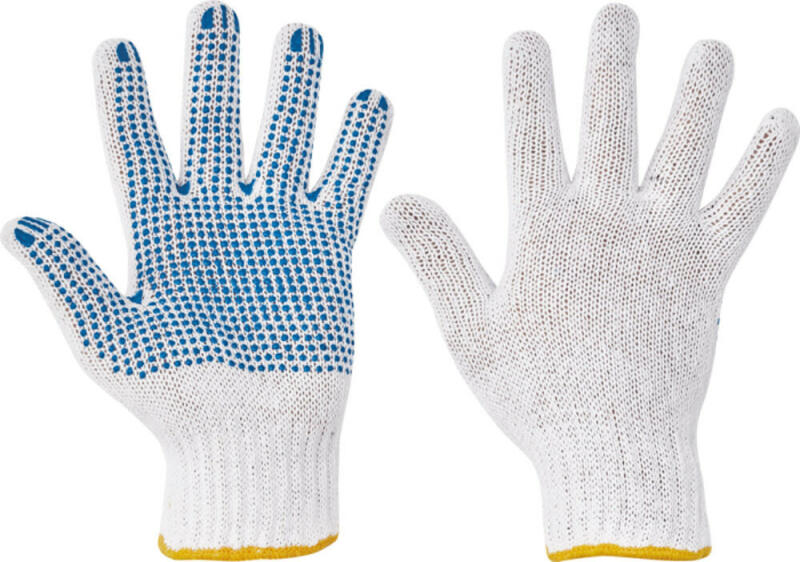 Poliészter/pamut keverékből készült, PVC-vel pontozott kesztyű. Poliészter/pamut keverékből készült, varratmentes kötött kesztyű PVC-vel pontozott tenyérrel és ujjakkal.