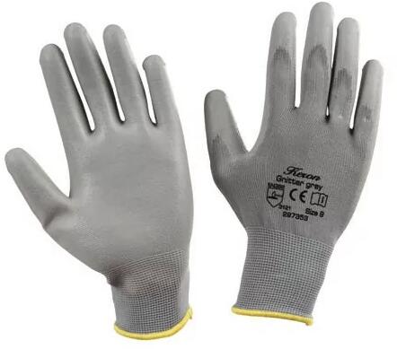 kötött, rugalmas, nagy szakító szilárdségú 100% poliészter szál tenyéren poliuraténnal mártott precíziós kesztyű gumírozott mandzsettával, szellőző kézháttal finom, 13-as kötés