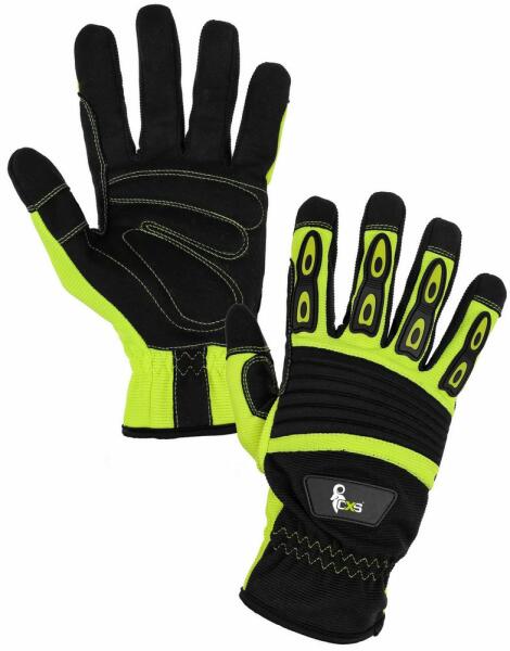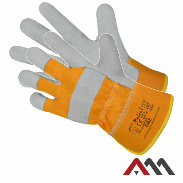 A termék leírása: Hasított, tehénbőrrel megerősített védőkesztyű a teljes tenyerén, a kézhát sárga farmer szövet. Jellegzetességei: a markolatrész nagyon jó minőségű, természetes színű tehén hasított bőrből készült, biztosítva a fogott tárgyak jó tapadását, külső rész sárga farmer szövetből készült, a mandzsetta fölé szorítószalaggal varrva, felső r
