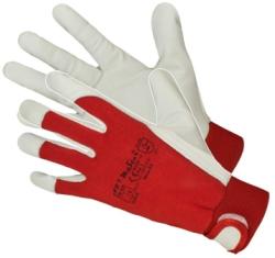 - kiváló minőségű, puha kecskebőrből készült munkakesztyű - - a kesztyű felső része egy rugalmas vörös szövet - gumis mandzsettával - tépőzárral kiegészítve kényelmes beállítást biztosít a csuklón - méret: 9, 10