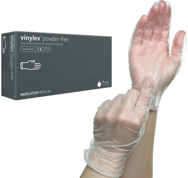 100 db-os kiszerelés Latexre érzékeny bőrűek számára ajánlott, vinyl anyagú, púdermentes kesztyű. A kesztyű típusa: vizsgálókesztyű, nem steril kivitelű anyaga: polivinilklorid kiszerelés: 100 darab felülete: sima csuklórész kialakítása: egyenletesen göngyölt a csuklórész vége alakja: univerzális, bal és jobb kézen egyaránt használható Felhasználási területek: