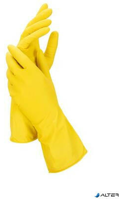 Természetes gumilatex háztartási kesztyű. Megfelelően érdesített tenyérrésszel rendelkezik, ami megkönnyíti a nedves környezetben végzett munkát, egyben javítva a fogást és a mozdulatok kontrollálását. - sárga színben - 1 pár/csomag - hosszabb szára (300 mm) védi az alkart