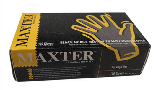 Prémium minőség, egyszer használatos, nem steril, púdermentes, teljes felületén mikro érdesített felülető egyszerhasználatos kesztyű. Kiszerelés: 100 db/dob. Anyag: nitril (5,5gr / 5.0 mil) Jellemzők: prémium minőség, egyszer használatos, nem steril, púdermentes, teljes felületén mikro érdesített, göngyölt szár, hossz: 240mm, mindkét kézen hordható Szín: fekete Mére