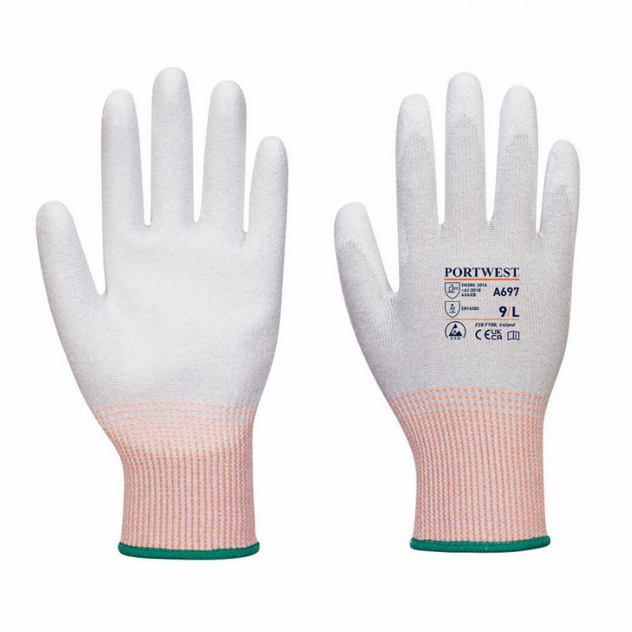 C szintű vágásbiztos kesztyű a vágások és éles tárgyak elleni védelemhez. 13g poliészter és szénszálas alapanyag, amely elvezeti a statikus elektromosságot. PU ujjvégmártott a kiváló fogásbiztonságért Ideális autóiparban, elektronikai összeszerelésekhez, teszteléshez és precíziós munkákhoz. Alkalmas a legtöbb érintőképernyős eszközzel való használatra. 12 pá