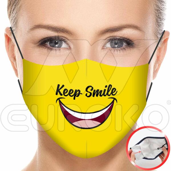 "Keep smile" mintás szájmaszk, cserélhető / behelyezhető szűrős kivitelben. Egyszerre véd és öltöztet! Emelkedjen ki a tömegből és hordjon stílusosan egyedi mintával készült textil szájmaszkot, amely a kialakításának köszönhetően akár aktív szenes szűrővel is használható! Figyelem! A termék 1db cserélhető szűrőt tartalmaz! Cserélhető szűrő vásárlása itt!