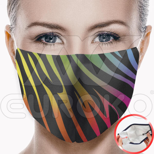 ÚJ "Színes zebra" mintás szájmaszk, cserélhető / behelyezhető szűrős kivitelben. Egyszerre véd és öltöztet! Emelkedjen ki a tömegből és hordjon stílusosan egyedi mintával készült textil szájmaszkot, amely a kialakításának köszönhetően akár aktív szenes szűrővel is használható! Figyelem! A termék 1db cserélhető szűrőt tartalmaz! Cserélhető szűrő vásárlás