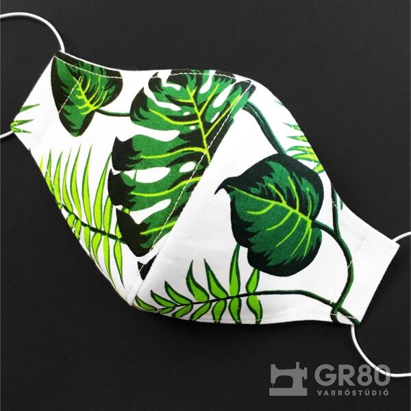 Zöld levél mintás (páfrány, könnyezőpálma) maszk, állítható fülpánttal, orrklipsszel, szűrőbetéttel. Külső és belső fele bőrbarát, OEKO-tex minősítésű 100% pamut. Kézzel készült magyar termék, minőségi anyagokból. Tökéletesen az arcra illeszkedik a formája. Női méretben. (Figyelem! Nem orvosi maszk! Viselése viszont jelentősen csökkentheti az allergiás, a