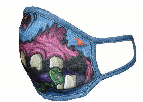 Állatmintás gyerek szájmaszk, zombi mintás. Mosható, nem minősül orvosi maszknak. Anyaga: 67,5% poliészter, 32,5% pamut. Méret: 16x13cm