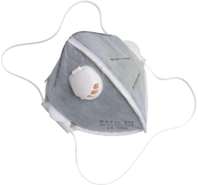 REFIL 641 részecskeszűrő P2 szeleppel, Összehajtható szűrőfélálarcok kilégző szeleppel és aktívszén réteggel a megengedett koncentrációk 12-szereséig szilárd és folyékony aeroszolok esetében, gőzök és gázok ellen legfeljebb az MK értékig: FFP2 NR .
