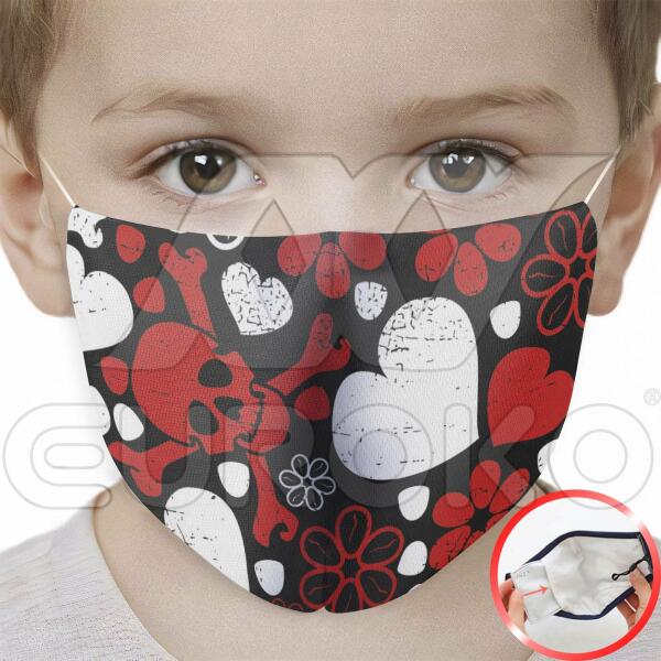Új "Koponya és szív" mintás gyermek szájmaszk , cserélhető / behelyezhető szűrős kivitelben. Egyszerre véd és öltöztet! Emelkedjen ki a tömegből és hordjon stílusosan egyedi mintával készült textil szájmaszkot, amely a kialakításának köszönhetően akár aktív szenes szűrővel is használható! Figyelem! A termék 1db cserélhető szűrőt tartalmaz! Cserélhető szűr