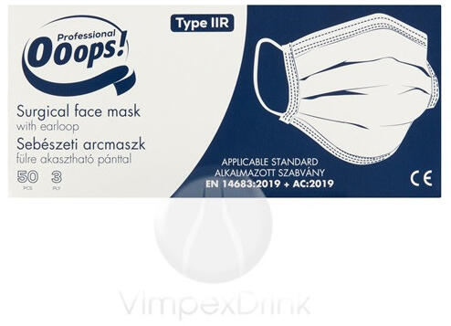 Termékleírás Termék információk Ooops! Professional Sebészeti arcmaszk, fülre akasztható pánttal Orvostechnikai eszköznek minősül Egyéb információk Alkalmazott szabvány: EN 14683:2019 + AC:2019 Baktérium Szűrési Hatékonyság: ≥98% Termék méret: 175 x 95 mm Tolerancia: ± 5% Orvostechnikai eszköznek minősül Type IIR