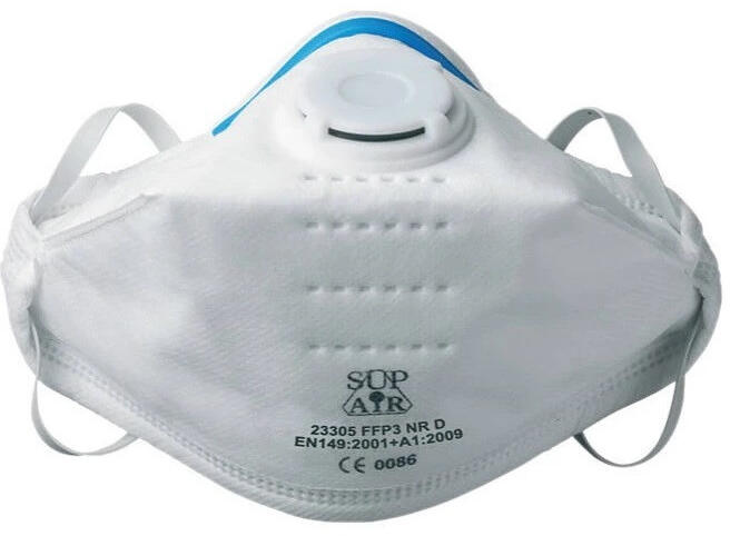 SUPAIR® PANELES FFP2 NR D szelepes légzésvédő pormaszk Cikkszám:23205 gyenge mérgek, mérsékelten veszélyes szilárd és folyékony részecskék ellen (pl. keményfa-porok, üveggyapot, műanyagok, ásványi olajok, fémpor és füst, alumínium, kvarc, réz, baktériumok) összehajtható paneles forma, higiénikus: minden darab külön tasakban; nem allergén D: az EN149-es szabvány ál
